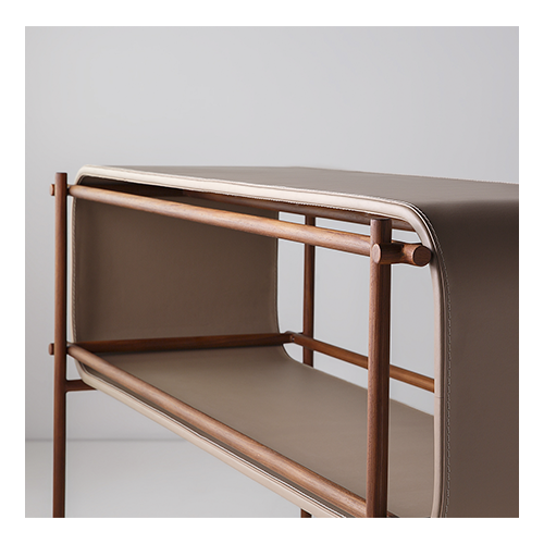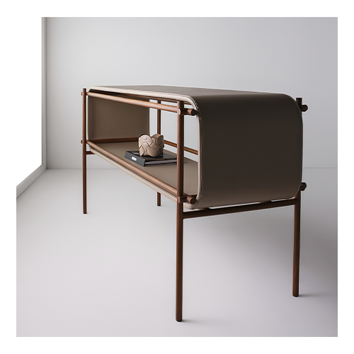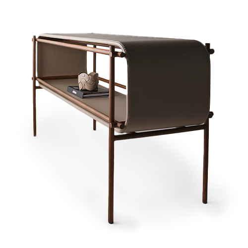 Aparador em metal com tampo em couro reconstituído.