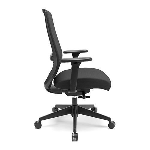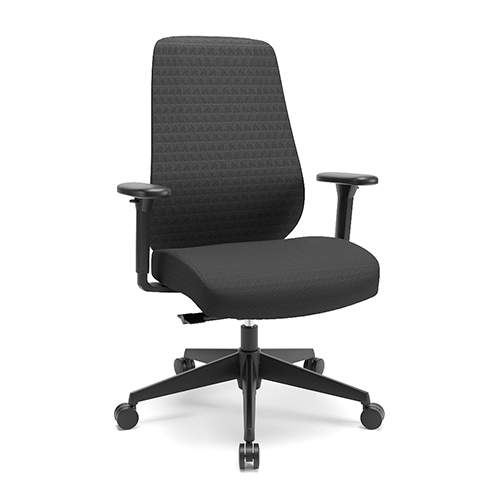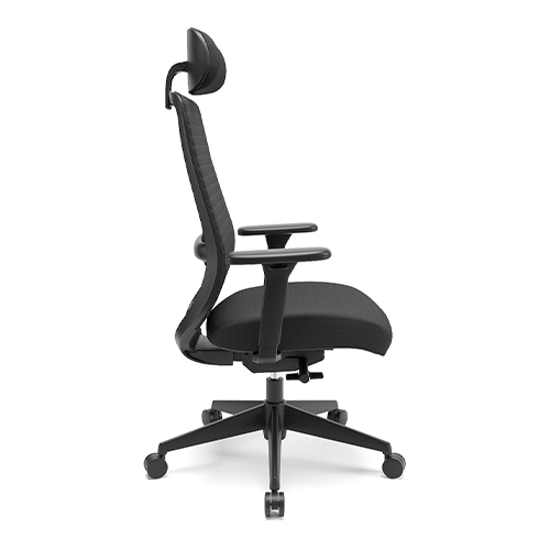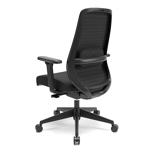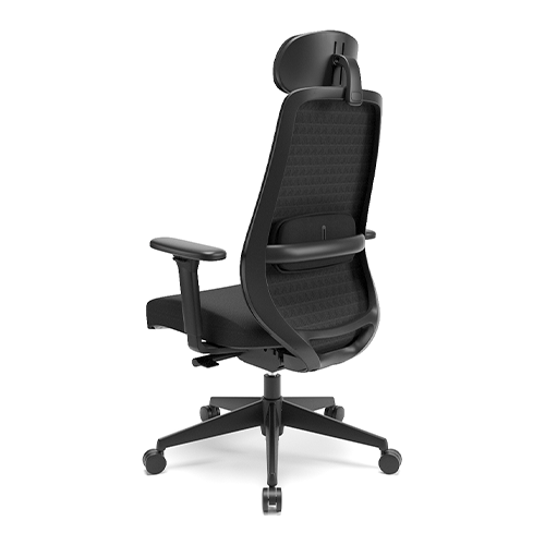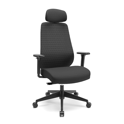 Apoio de cabeça tapeçado e integrado. Tecido do encosto perfurado e textura 3D. Apoio lombar estofado com regulagem de altura. Base injetada. Apoio de braço 3D.