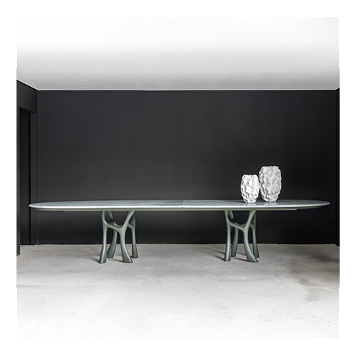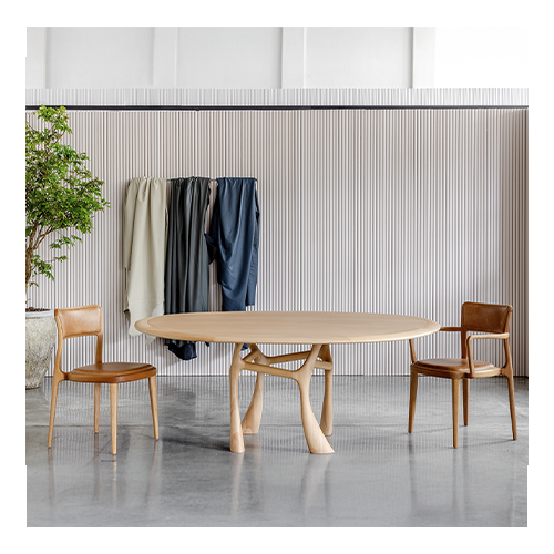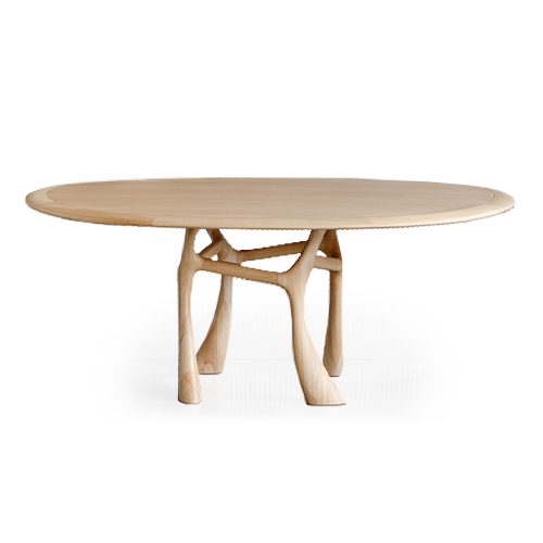 Tampo em mármore ou laminado madeira com borda em madeira maciça. Pés em madeira maciça. Centro giratório embutido opcional (modelo redondo).