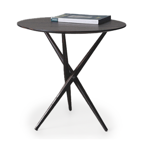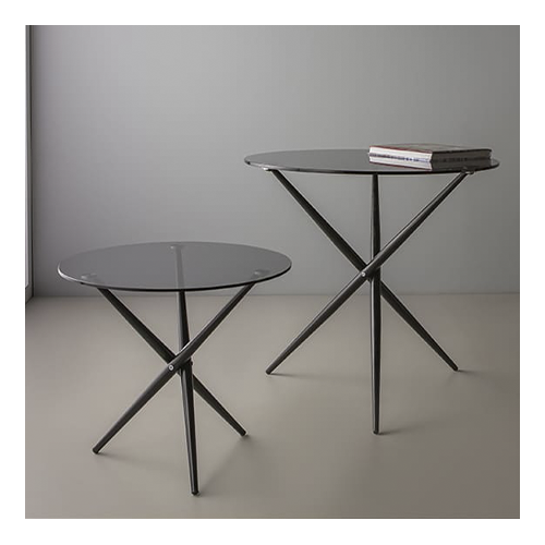 Mesa lateral em metal com tampo em madeira, vidro ou laca.