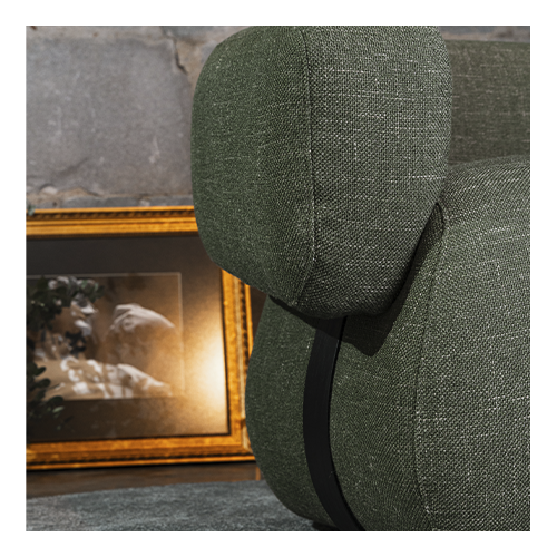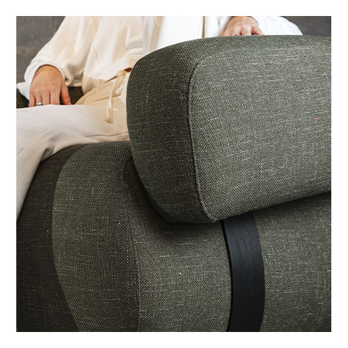 Apoio dos braços em aço com pintura ou laminado madeira natural. Estrutura interna em madeira maciça e compensado multilaminado com percintas em trama e espumas de várias densidades com alta resiliência e fibra siliconada. Revestimento em tecido ou couro natural.