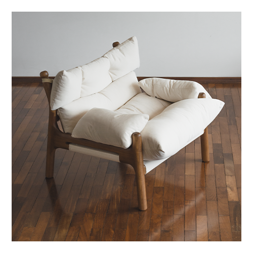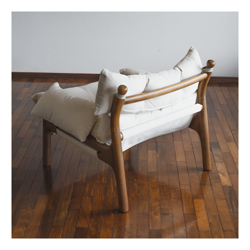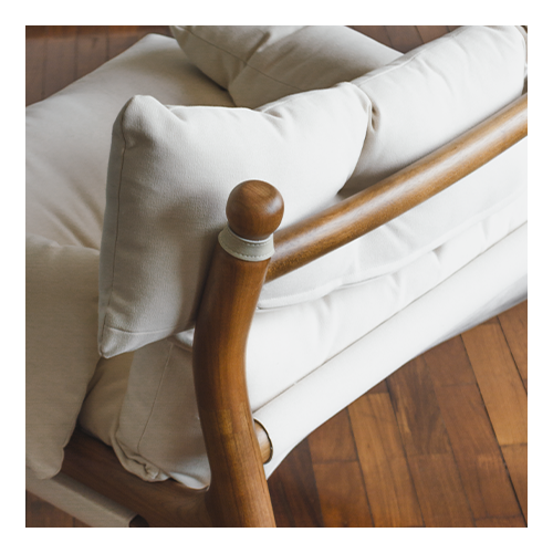 Poltrona Maria com pufe (vendido) – Estrutura em madeira maciça com acabamento Castanho. Assento e encosto revestidos em lona tom areia com alças em couro natural. Medidas (cm) – Poltrona – Altura: 88 / Largura: 100 / Profundidade: 87. Pufe – Altura: 64,9 / Largura: 86 / Profundidade: 58