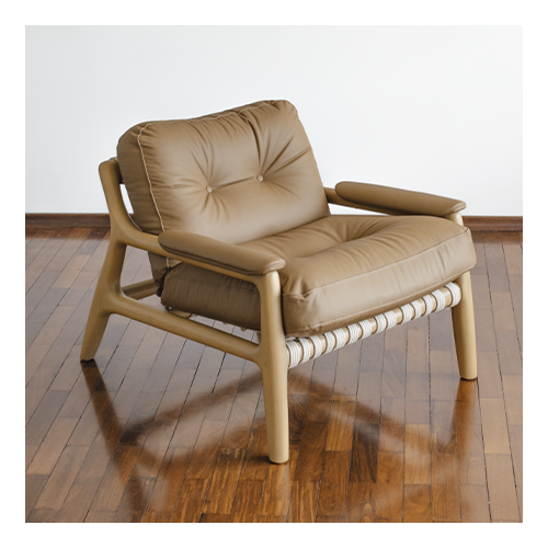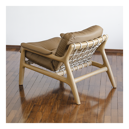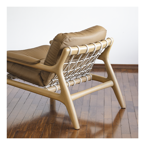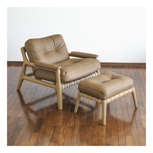 Poltrona Rede com pufe – Estrutura em madeira Tauari natural. Base do assento e encosto em trama de corda de algodão. Almofadas do assento e encosto revestidas em couro natural Matte Caramelo. Medidas (cm) – Altura: 78 / Largura: 46 / Profundidade: 78 (poltrona) Altura: 39 / Largura: 66 / Profundidade: 49 (pufe)