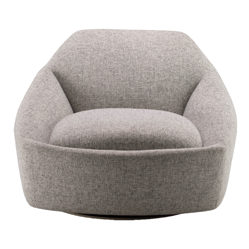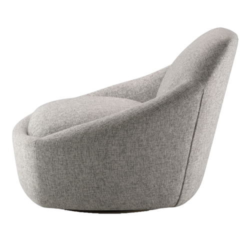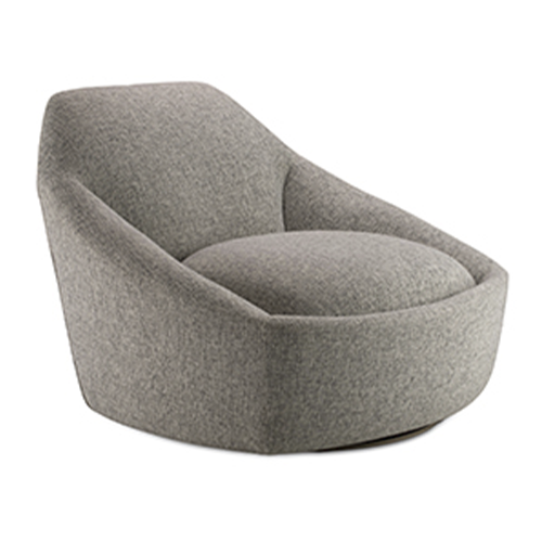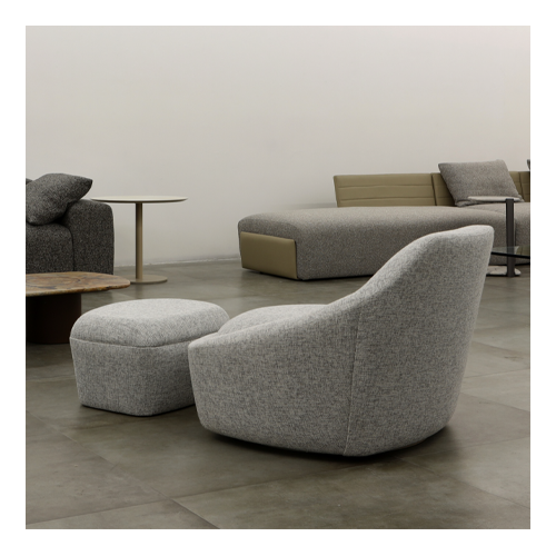 Poltrona giratória estofada com base em aço carbono pintado. Opção de pufe estofado fixo.